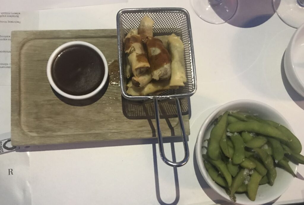 Το καλωσόρισμα περιείχε κλασικές γεύσεις Ασίας όπως φασολάκια σόγιας Edamame με ανθό αλατιού, Springrolls και σάλτσα δαμάσκηνου hoisin.