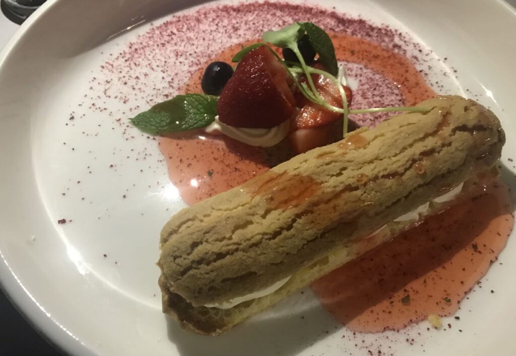 Το επιδόρπιο δεν έριξε καθόλου τον πήχη της απόλαυσης και της ισορροπίας των γεύσεων. Ανάλαφρο και ταυτόχρονα τραγανό εκλαίρ, με απαλή κρέμα γιαούρτι, lemon-lime και γλυκό coulis καρπούζι – δυόσμου. Το τέλειο κλείσιμο σε ένα γεύμα απαιτήσεων.