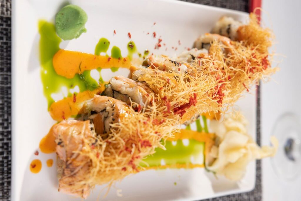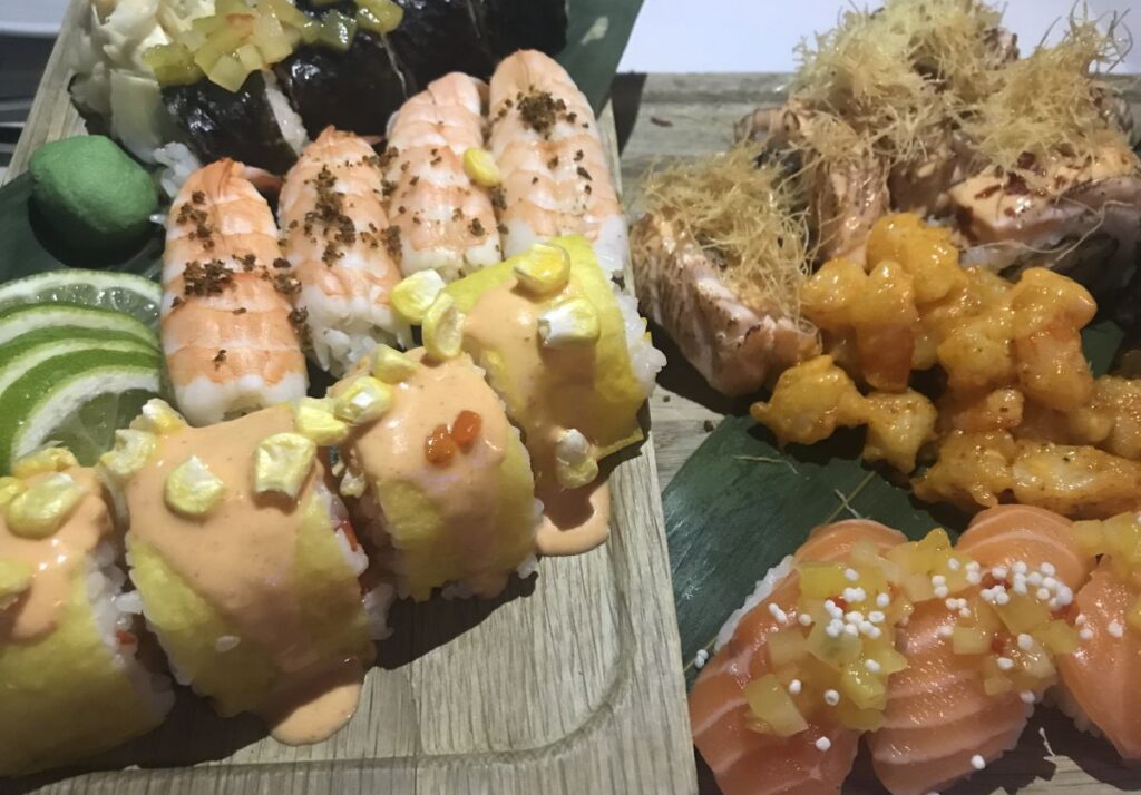 Στη συνέχεια ο chef ετοίμασε ένα πλατό με τα καλύτερα sushi της Θεσσαλονίκης, όπου κάθε κομμάτι έχει τέλεια υφή και ισορροπία γεύσης. Δοκιμάσαμε makirolls με πικάντικο τόνο, αγγούρι, μαγιονέζα lemongrass, ρόκα, πικάντικο mango. Βραχάκια γαρίδας τεμπούρα, tartare σολομού και ponzu, κόκκινη πιπεριά, φύλλο σόγιας με κουρκουμά, μαγιονέζα, sriracha και τραγανό καλαμπόκι. Στα uramakirolls η γεύση του τραγανού ρυζιού ταίριαζε με τον καψαλισμένο σολομό και το καβούρι, την πιπεράτη γεύση της ρόκας, την ελαφρώς πικάντική μαγιονέζα sriracha, το τραγανό κανταΐφι και τα flakes τομάτας.