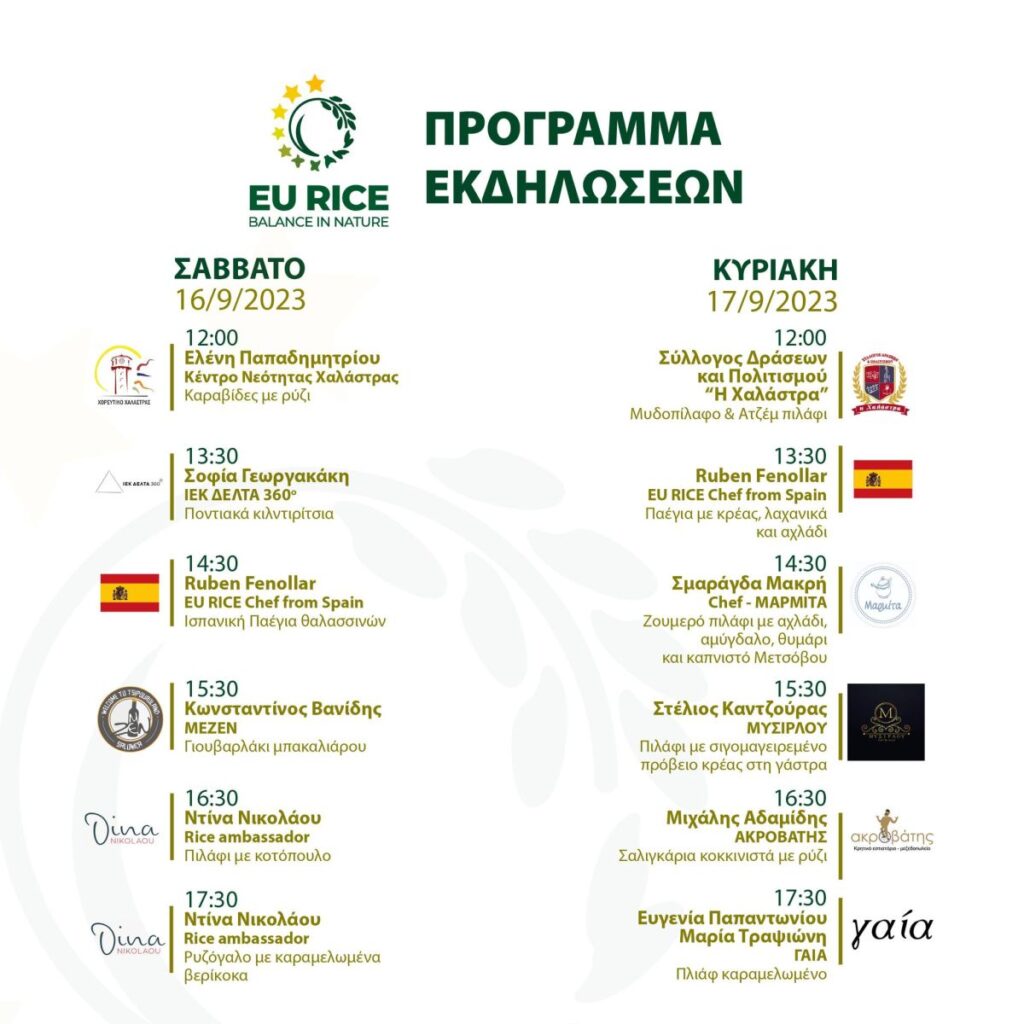 Το Σάββατο 16 και την Κυριακή 17 Σεπτεμβρίου 2023 από τις 12:00 έως τις 19:00 στον ειδικά διαμορφωμένο εξωτερικό χώρο μεταξύ των περιπτέρων 10 και 13, οι επισκέπτες θα έχουν τη δυνατότητα να ενημερωθούν για τη βιωσιμότητα, ασφάλεια και ποιότητα της καλλιέργειας ρυζιού και των προϊόντων της, αλλά και να γευτούν 12 μοναδικές συνταγές με βάση το ευρωπαϊκό ρύζι, που παράγεται στην Ελλάδα και την Ισπανία.