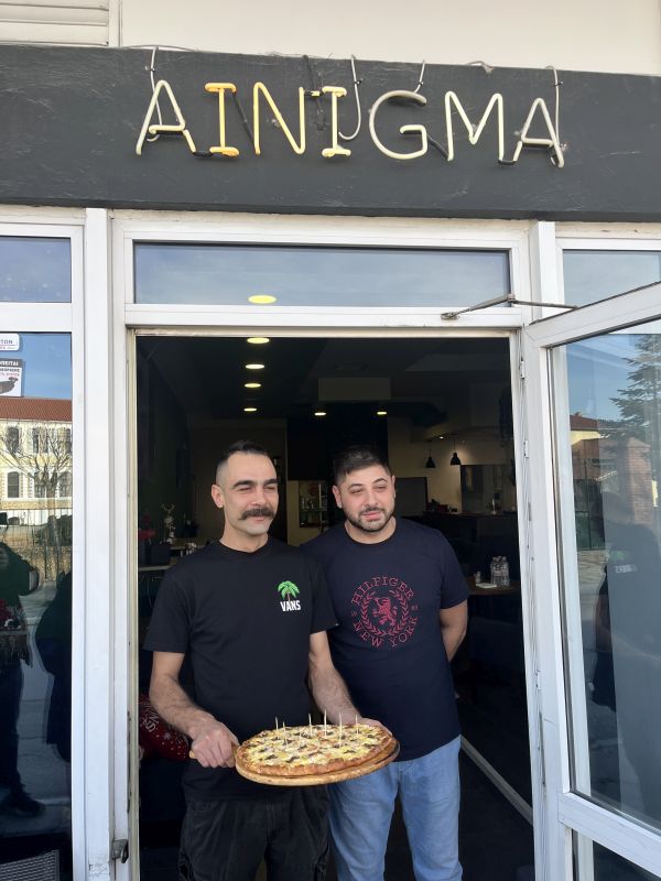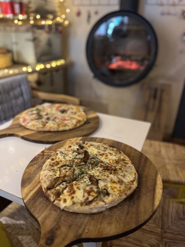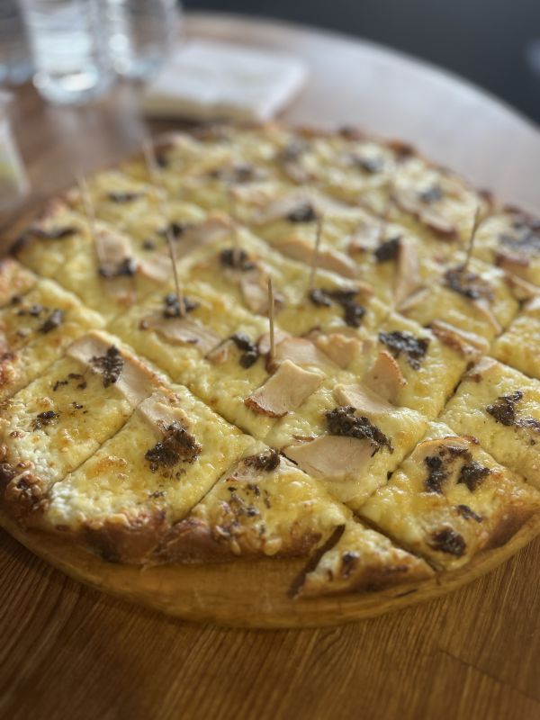 Παρότι χορτάτοι, συνεχίσαμε γιατί είχαμε φτάσει στη μέση του “Eat & Walk – Arnaia edition”. Στο Αίνιγμα, ο Βασίλης είχε μόλις ξεφουρνίσει μια πίτσα με λευκή κρέμα, κοτόπουλο και ντουξέλ μανιταριών με καλοκαιρινή τρούφα. Αν δίνονταν βραβεία πίτσας, θα της έδινα το χρυσό!