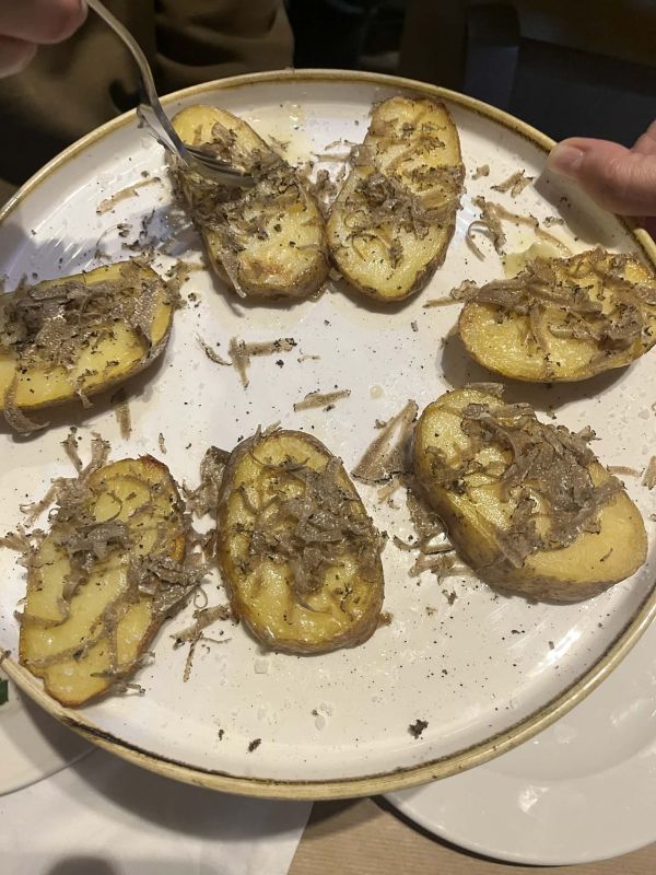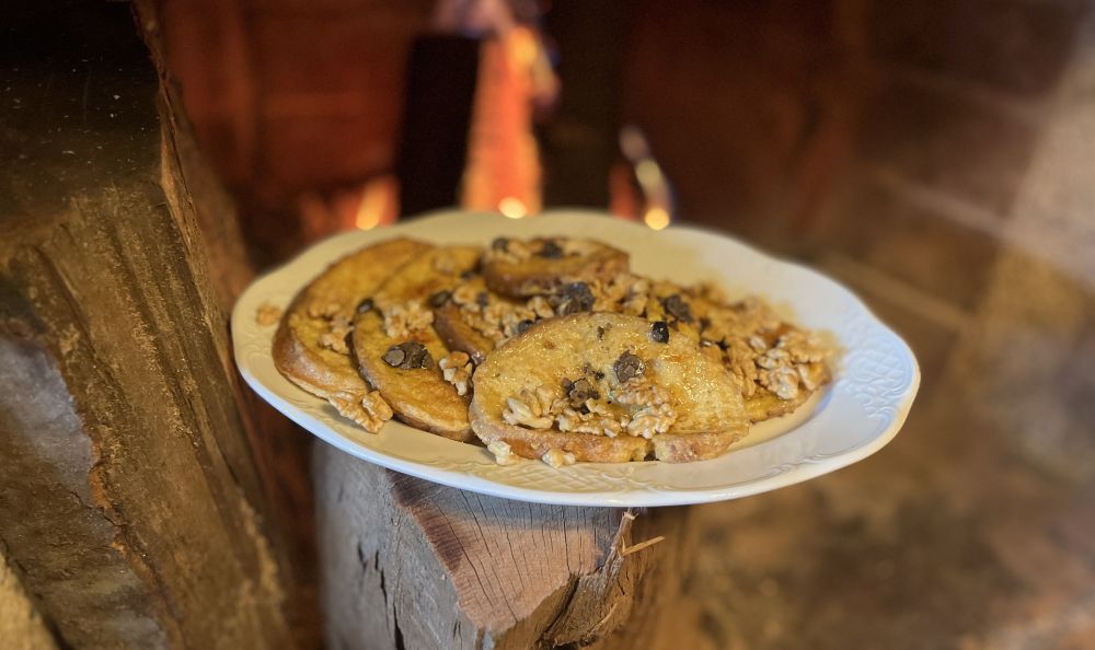 Έπειτα, ο Θεοδόσης μας άνοιξε τις πόρτες και του Oikies Alexandrou Traditional Inn, όπου η γλυκύτατη Τασούλα μας σέρβιρε μια εξαιρετική σούπα τραχανά, δικής της παρασκευής, με ντόπιο γάλα από τα κατσικάκια τους. Στη συνταγή είχε προσθέσει αποξηραμένα μανιτάρια, τα οποία είχε κονιορτοποιήσει, δίνοντας βάθος και ένταση στη γεύση. Η συνέχεια περιλάμβανε αυγοφέτες με χειμερινές τρούφες, μέλι Αρναίας και καρύδια, ένα πιάτο που προσφέρεται και στο πρωινό του ξενοδοχείου.