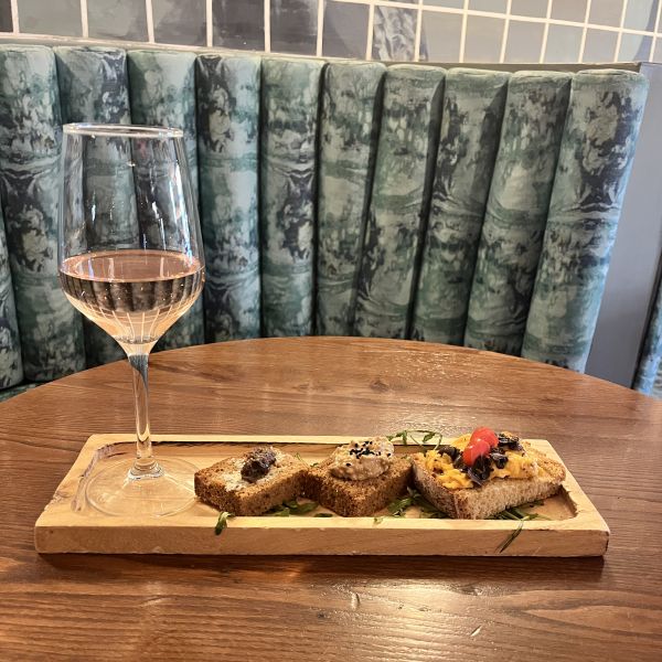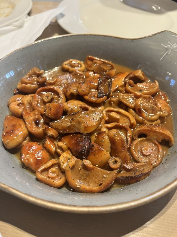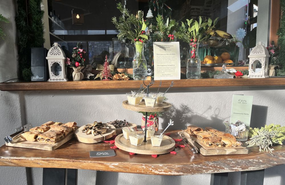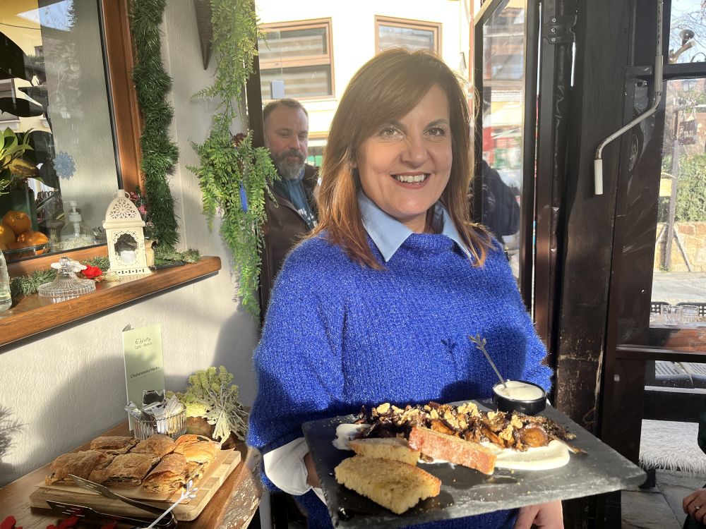 Επόμενη στάση το Eleni Cafe Bistrot, όπου η δραστήρια και πάντα φιλόξενη Ελένη Καραντώνα μας κέρασε μανιταρόπιτα, φτιαγμένη με χωριάτικα αυγά, αγριομανίταρα και φέτα Αρναίας. Τη συνδυάσαμε με ροζέ οίνο Domaine Agrovision. Ακολούθησε ένας παραδοσιακός τσιπουρομεζές με αποξηραμένα πορτσίνι μανιτάρια, σωταρισμένα σε ντόπιο ελαιόλαδο και σερβιρισμένα πάνω σε λευκή σάλτσα από φέτα και μέλι Αρναίας.