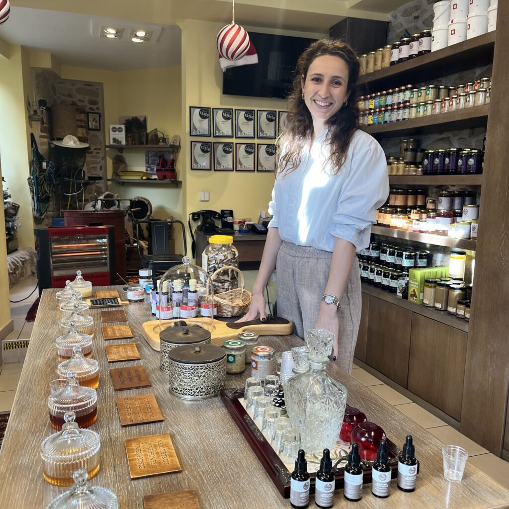 Ακριβώς απέναντι, μας υποδέχθηκε η Κωνσταντίνα στην Georgakas honey άλειψε σε φρέσκο, προζυμένιο, αφράτο ψωμί του Λαλιώτη Σπιτική Νοστιμιά – Greek flavours όλα τα μείγματα μανιταριών του Forest Garden, ενώ τα ποτήρια γέμισαν με μουντοβίνα. Η μουντοβίνα, το απόσταγμα από μέλι, είναι μία εμπειρία που αξίζει να την έχεις.