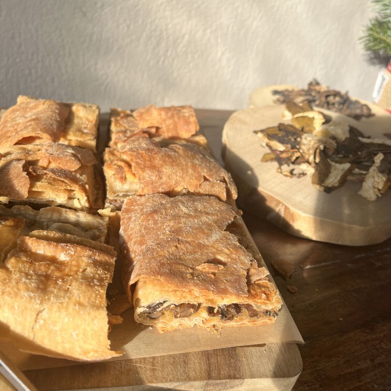 Το πρόγραμμα είχε για τη συνέχεια, βόλτα στη στολισμένη πλατεία της Αρναίας. Στον Πολυχώρου Αριστοτέλους συναντήσαμε το Θεοδόση και την Εύη, οι οποίοι μας παρουσίασαν τη δική τους γαστρονομική δημιουργία με τα μανιτάρια και τις τρούφες της περιοχής. Το αποτέλεσμα είναι δύο πίτσες με λεπτή ζύμη και boletus edulis (καλογεράκια), θυμάρι και ρίγανη, εξαιρετικά τοπικά τυριά.